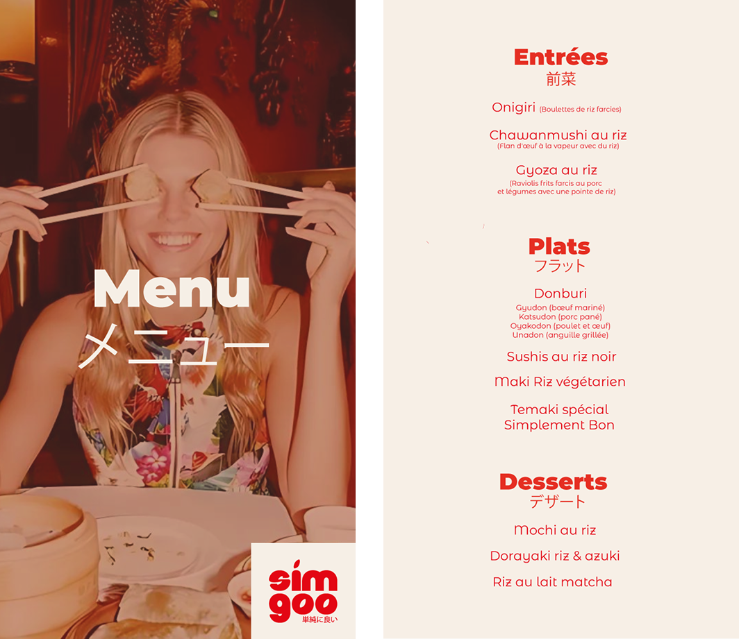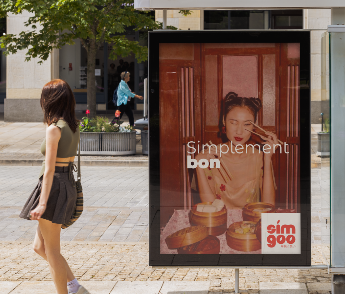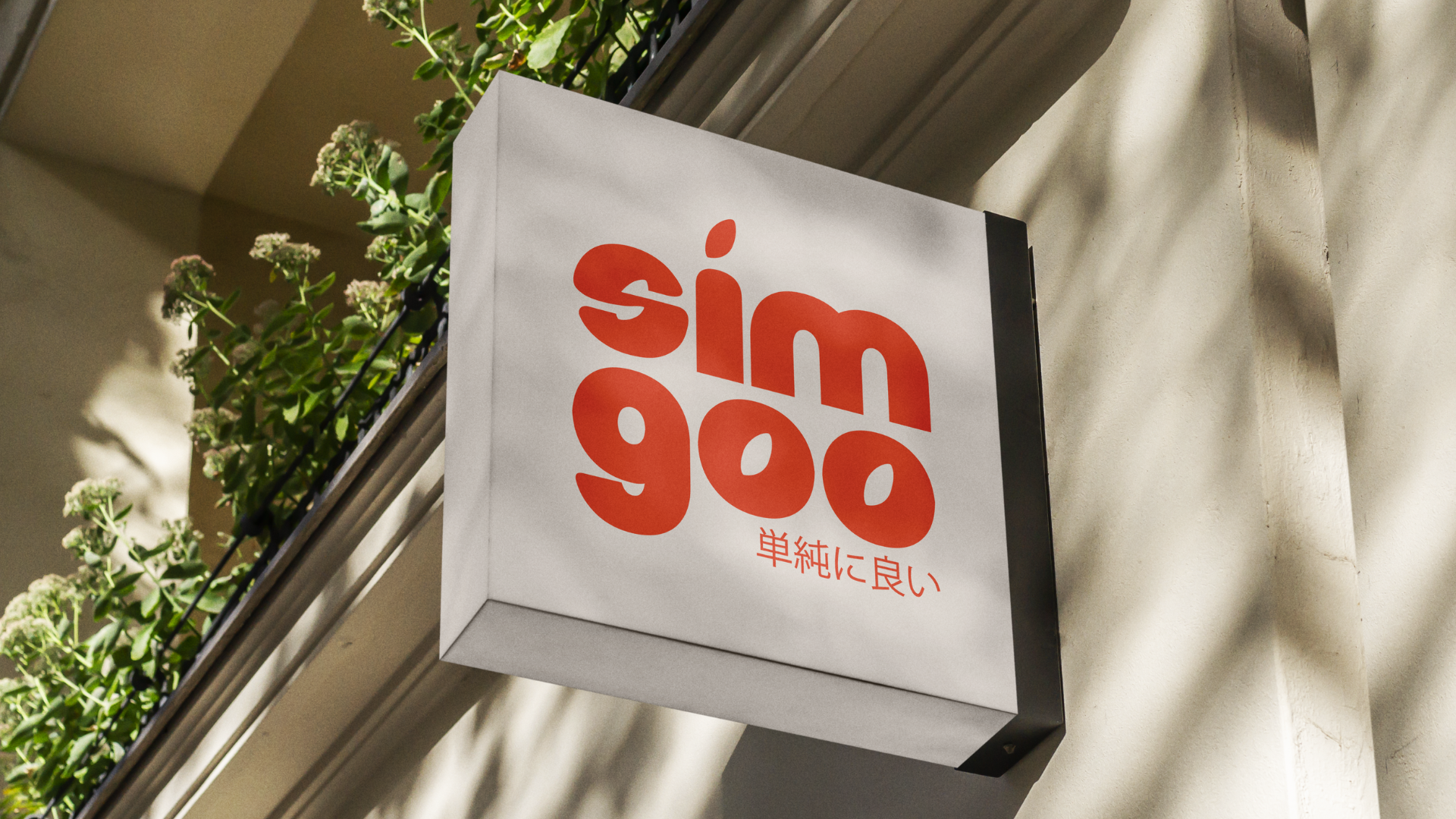 Simgoo est une nouvelle marque alimentaire japonaise inspirée par l’esthétique minimaliste d’Uniqlo. Son logo reprend la forme carrée rouge et la structure 3+3 lettres sur deux lignes, en clin d'œil à l’icône visuelle de la marque textile, tout en s’en détachant par un univers propre, centré sur la gastronomie.